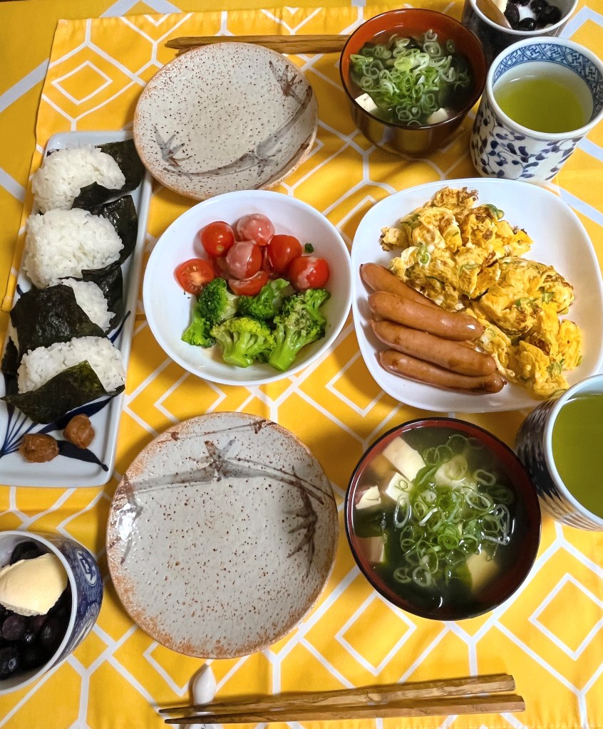 おにぎり・豆腐とわかめの味噌汁・卵焼き・ウィンナー・野菜・ヨーグルト(ブルーベリーとバニラアイス添え)