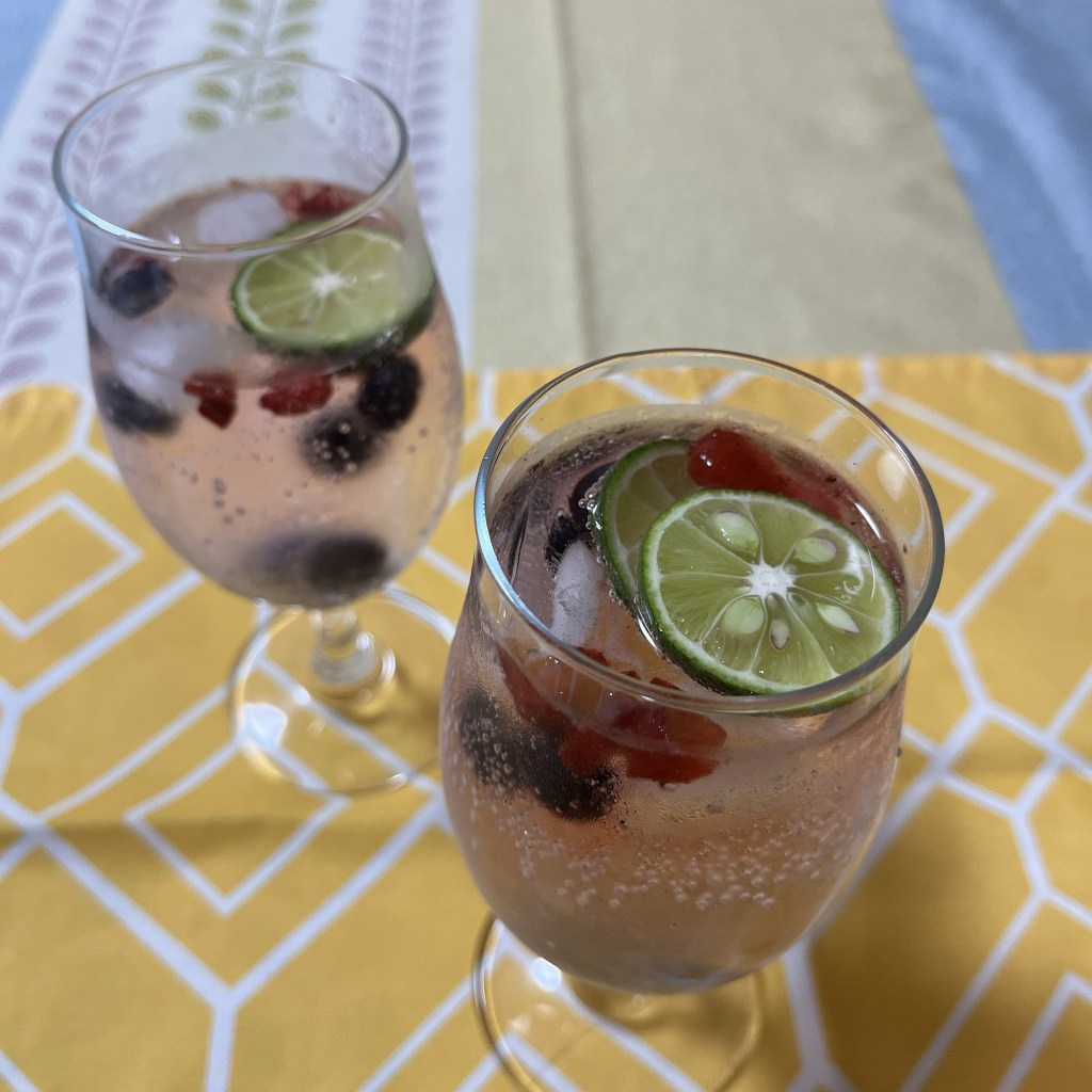 妻の免疫力が少し下がり気味なので、疲労回復炭酸ドリンク作りました。三ツ矢サイダーと炭酸水をバランスよく混ぜて、それにベリーを入れて、柑橘であり旬のスダチを入れる。